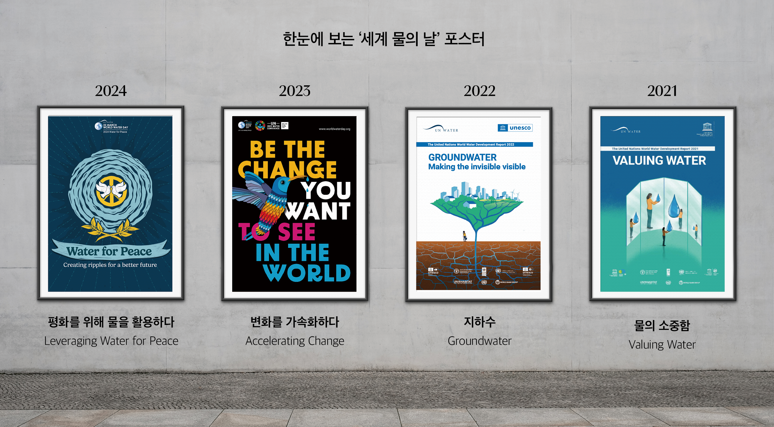 ‘세계 물의 날’은 유엔총회가 지난 1992년 12월, 물의 소중함을 알리고 물 문제를 해결하기 위한 각국의 관심과 협력을 촉구하기 위해 제정하였다. 유엔총회는 매년 물관리 비전과 방향성을 홍보하기 위한 주제를 선정하고 있다. 올해 세계 물의 날 주제는 ‘평화를 위한 물의 활용(Leveraging Water for Peace)’이다. 정부와 지역사회 등 다양한 주체들이 한데 모여 물관리 협력을 도모하고, 모두가 공존하는 세상을 만들 수 있음을 중의적으로 표현하고 있다.