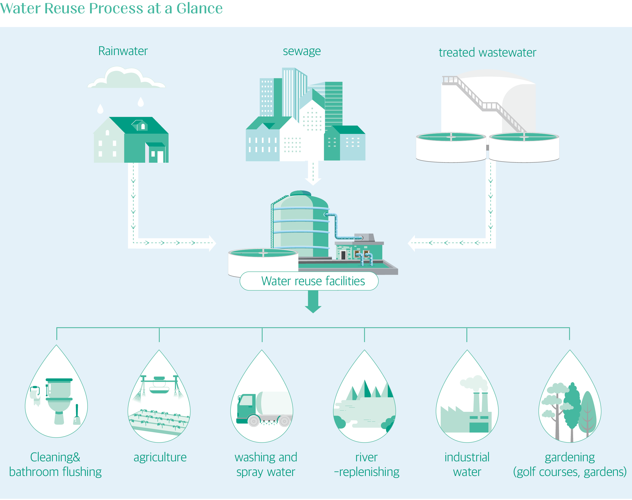 What about water? Water is also a limited resource and is becoming continuingly less available for different reasons. There have been growing concerns for many years over water shortages, highlighting the importance of sustainable water management. Global water consumption has increased 6.7 times in the 20th century as a result of the growing global population, industrialization and increased farming. As a result, natural water resources alone can no longer meet the demand sustainably. Water demand will only steeply rise and projected to increase over 35% by 2050. At the same time, the water supply is adversely affected by climate change resulting from accelerating global warming, unstable precipitation and rising water temperature. Given this, it has become even more imperative to reuse water. Water reuse involves reclaiming water from various sources by treating and reusing it. Rainwater, sewage, wastewater and thermal effluents are treated at water treatment facilities and used for various purposes. Water reuse is not only a key strategy for effectively conserving natural water resources and promoting sustainable water management but also an effective tool to respond to climate change.