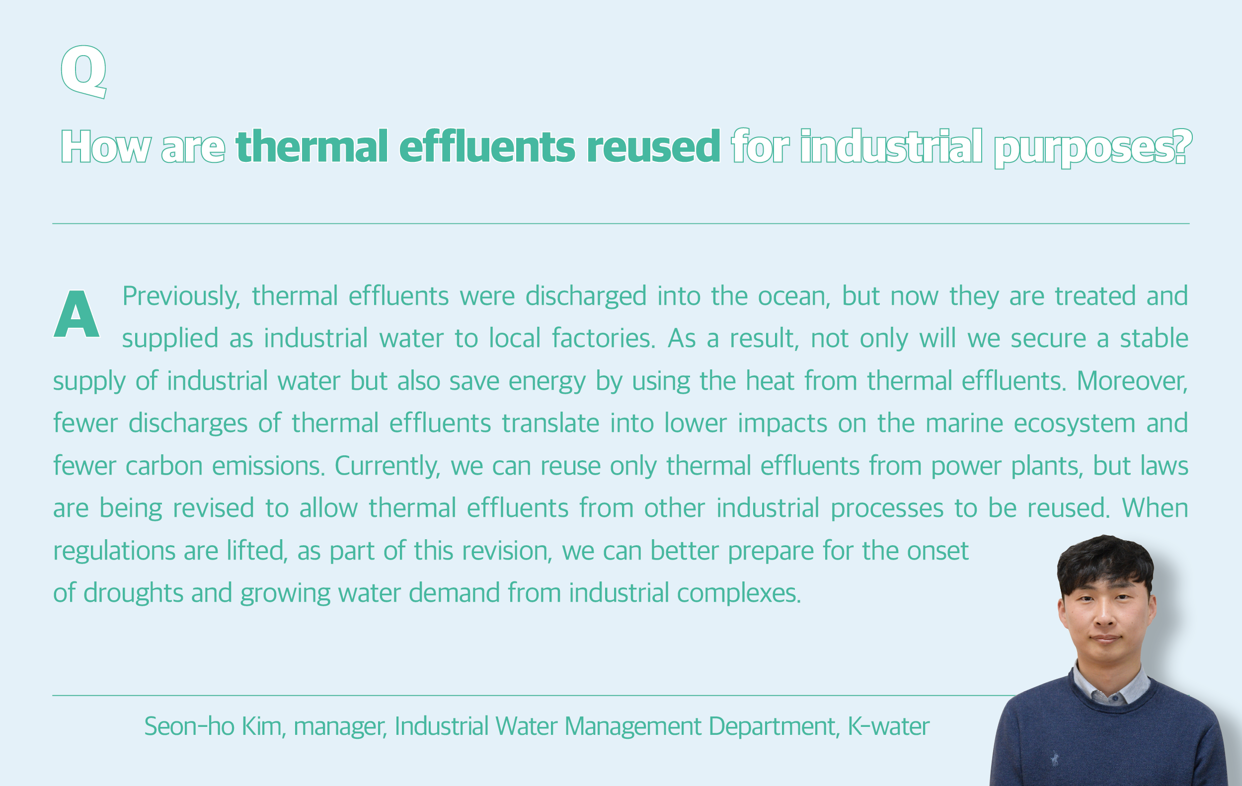In addition, K-water is seeking solutions to reuse thermal effluents and secure more industrial water. Thermal effluents entail the discharge of water used for cooling at power plants into the ocean. Since the water travels solely through a pipeline until it is discharged into the ocean, it is not contaminated.