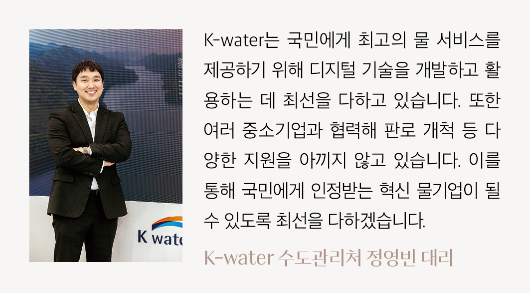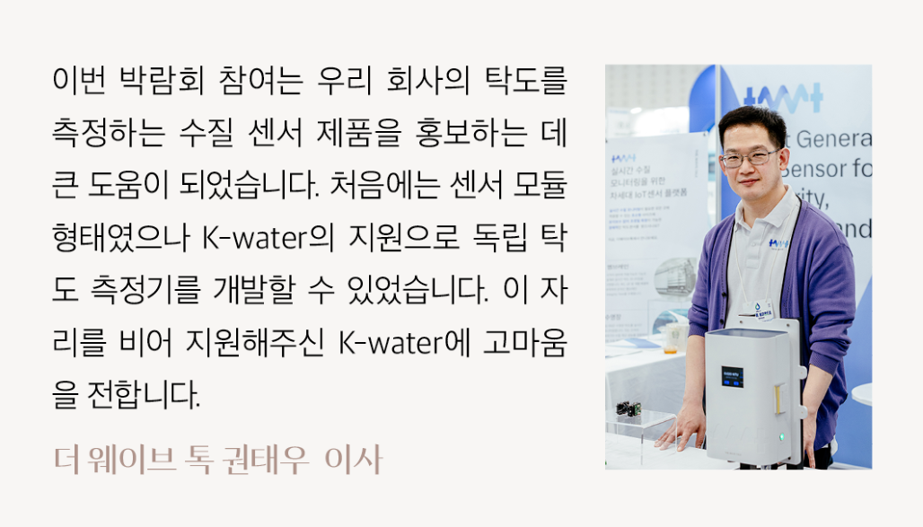아울러 K-water는 협력관계에 있는 중소기업들의 기술을 홍보하고 판로를 지원하는 공동기업관도 운영했다. 공동기업관에는 해외시장개척단, 미국 CES 혁신상 수상 기업, 협력 스타트업 등 20여 개 기업이 함께 참여해 자리를 빛냈다.