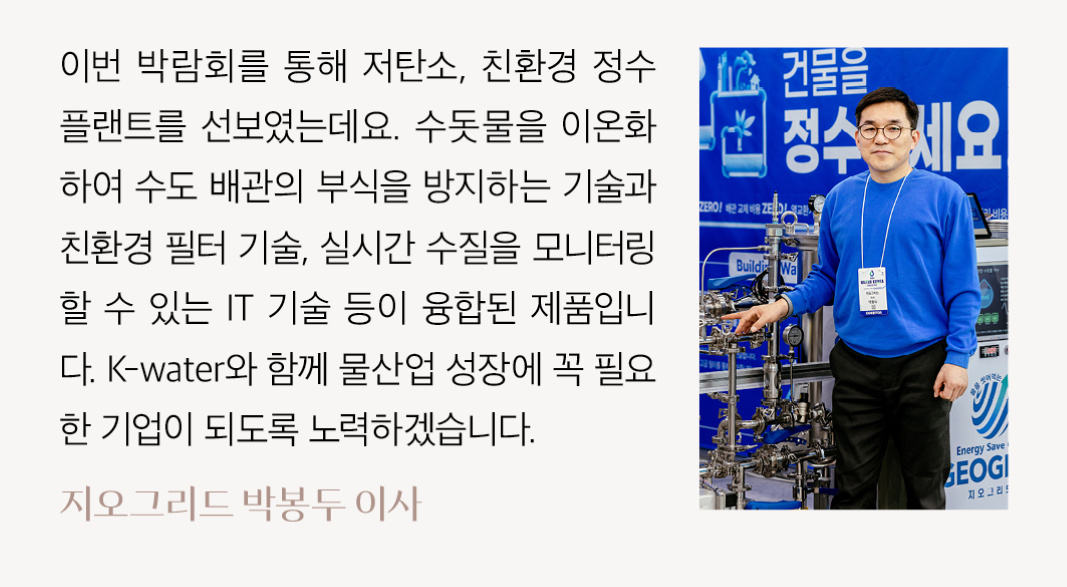 지난 3월 22일, ‘세계 물의 날’을 맞아 대전컨벤션센터 제1전시장에서 기념식이 열렸다. ‘함께 누리는 깨끗하고 안전한 물’이라는 주제로 열린 기념식과 더불어 제2전시장에서는 ‘제21회 국제물산업박람회(Water Korea 2024)’도 함께 개최되어 많은 방문객들의 발길이 이어졌다.