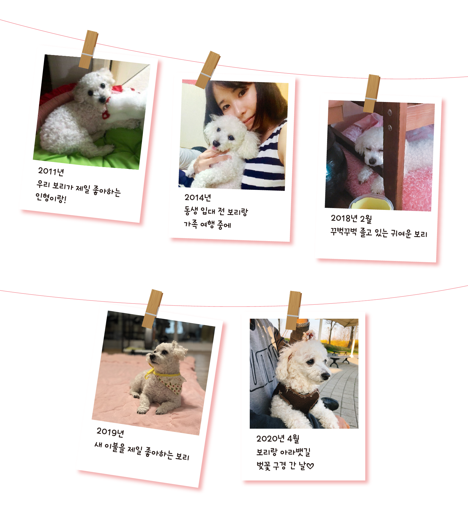 가족들은 여전히 ‘2009년의 어느 겨울날’을 기억한다. 반려견 보리가 우리집에 와 가족이 된 날이다. 이웃집의 강아지가 낳은 아이들 중에 가장 작고 연약해 보이는 녀석이 눈에 밟혀 입양을 결심하게 되었고, 걱정과 달리 보리는 형제들 중에 가장 건강하게 자라주었다. 당시 중학생이었던 하상화 대리는 “사춘기 시절 마음을 터놓을 수 있는 좋은 친구가 보리였어요”라며 오랜 옛 기억을 꺼내놨다.