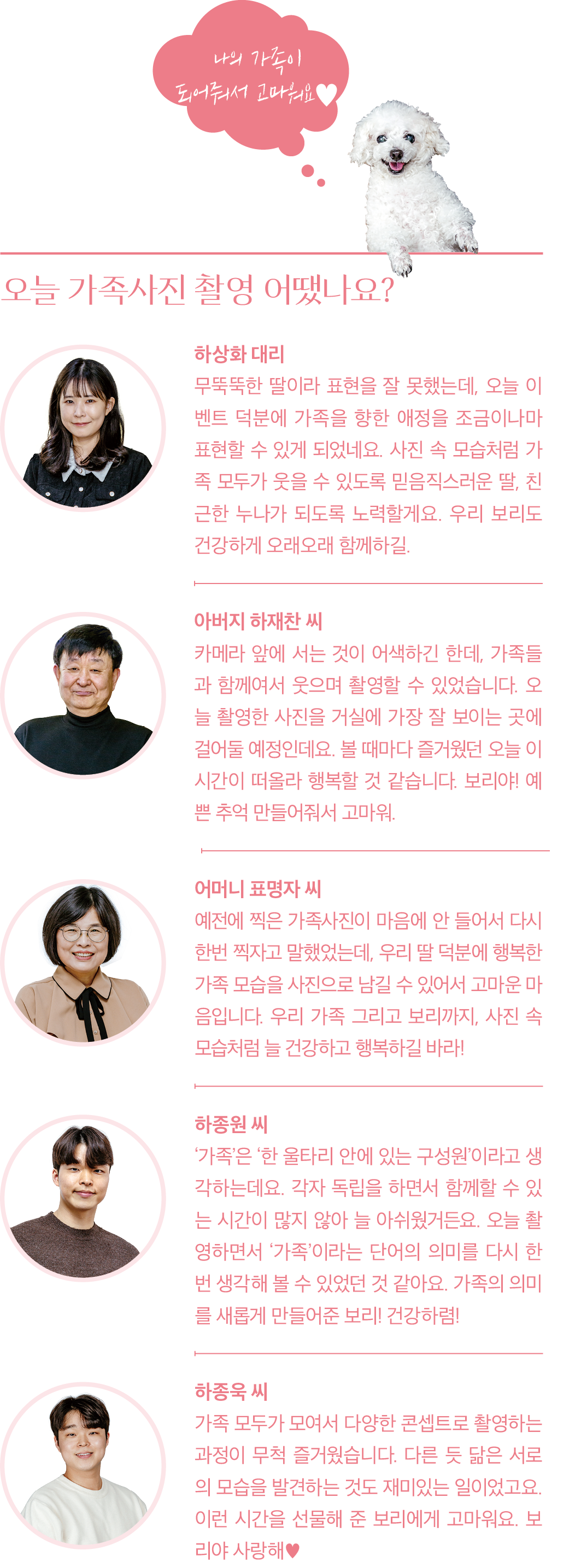 “우리 보리를 보면 아직도 아기 같은데, 벌써 16살이 됐어요. 눈도 잘 안 보이고, 활동량도 부쩍 줄었고요. 그래서 보리가 조금 더 나이가 들기 전에, 보리와 우리 가족의 모습을 사진으로 남겨놓고 싶었어요. 사진을 보면 ‘행복한 오늘’을 떠올릴 수 있도록 말이죠.”