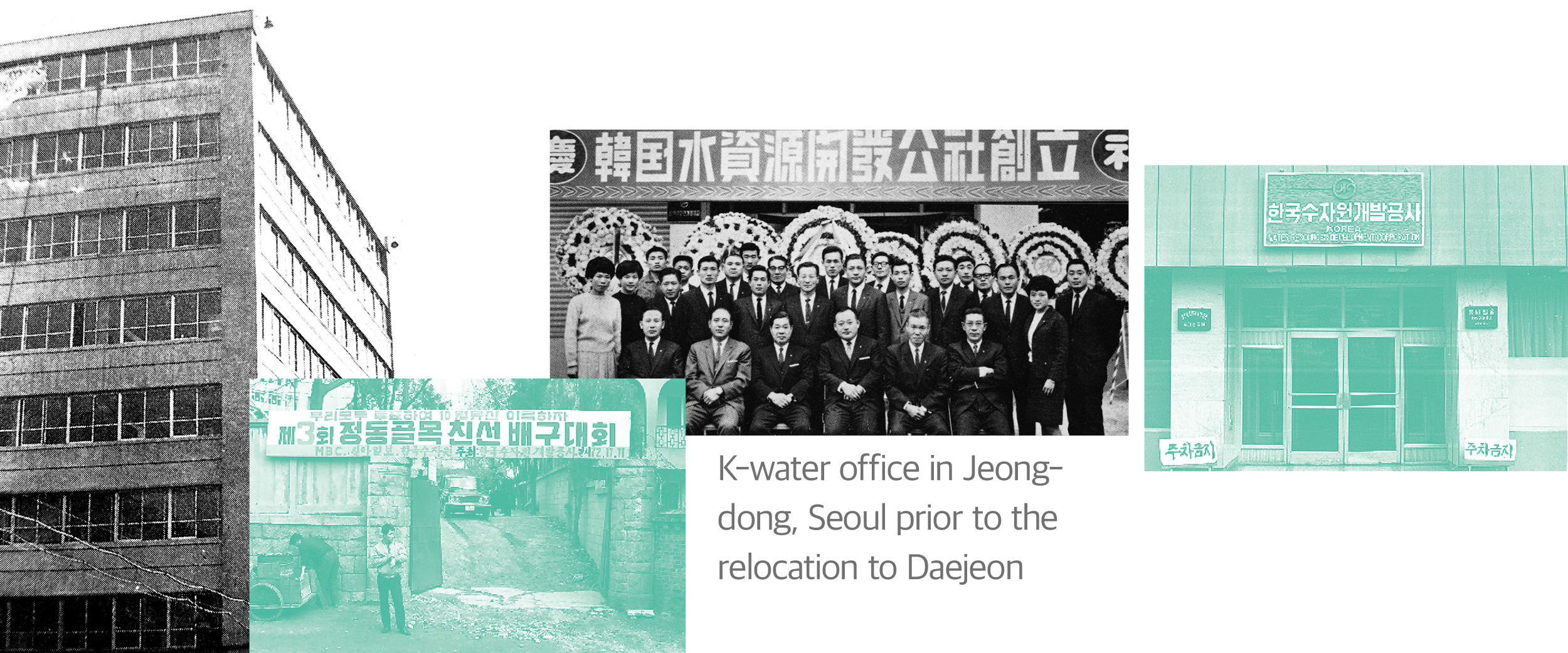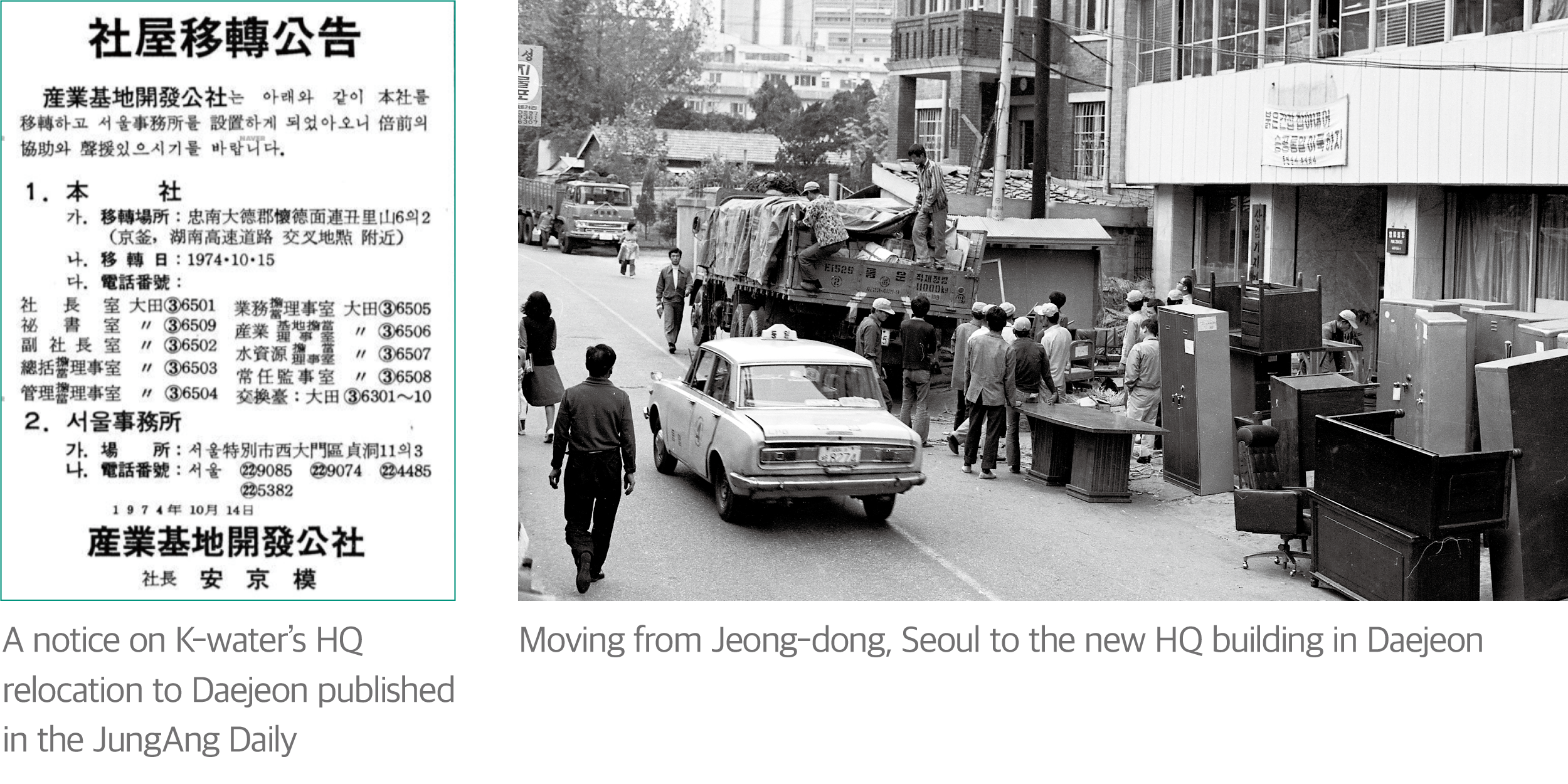 K-water was the first public corporation that moved out of Seoul to Daedeok-gun, Daejeon City on October 16, 1974. After the construction of the new head office building was completed, Daehan Express, a major moving company, was hired for the relocation, which was finished in a day like a military operation. Not many K-water employees were happy about the move. Since its foundation in 1967, K-water had rented Pyungjeon Building as its head office in Jung-dong, Seodaemun-gu in Seoul, and in a span of 7 years, many employees started families and built their lives in Seoul.