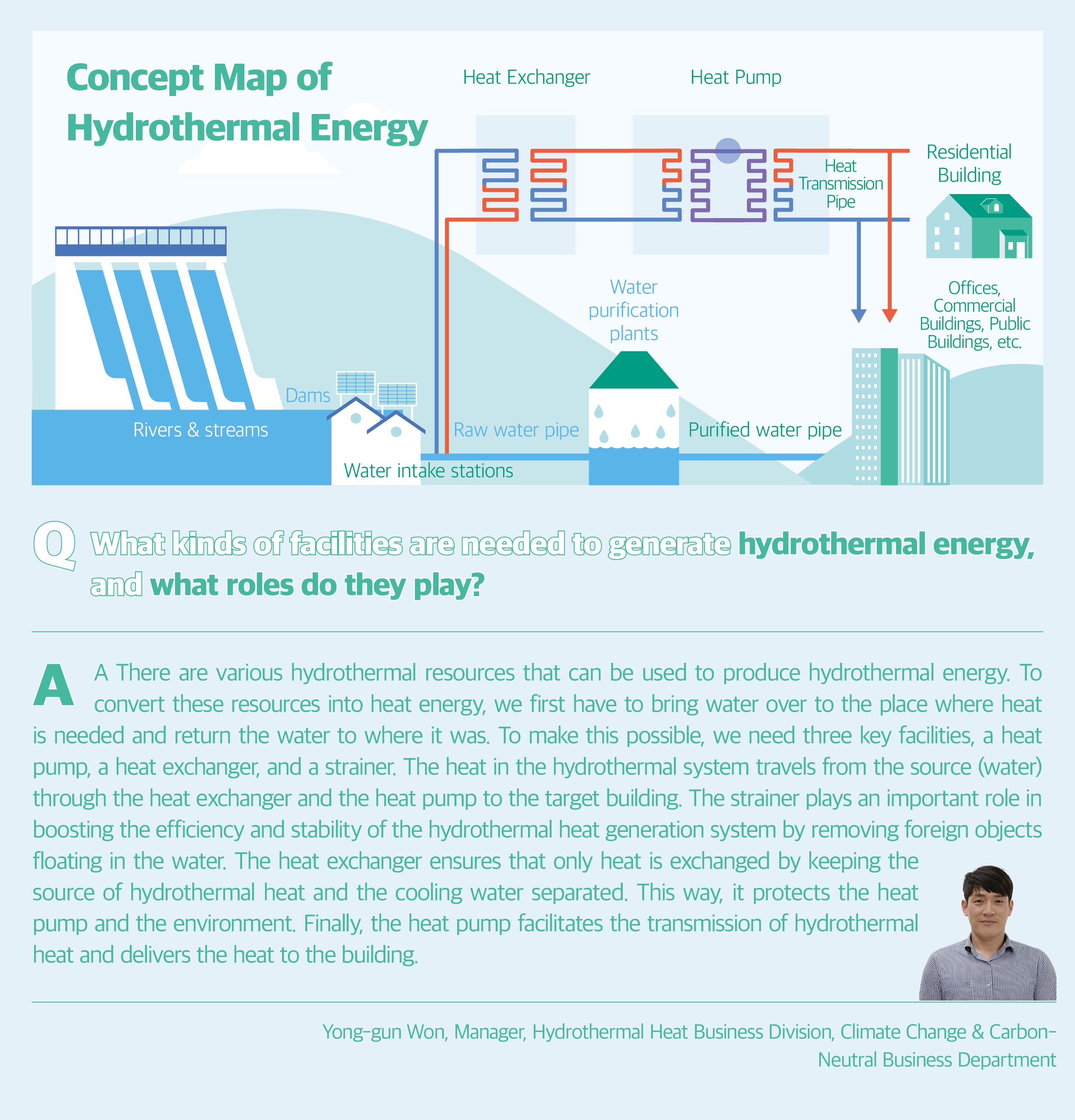 Hydrothermal energy refers to heat energy produced from hydrothermal heat, which is used for cooling or heating. Recently, Korea with its abundant stream water and sea water, Korea has recently been stepping up efforts to develop hydrothermal energy. Hydrothermal energy is renewable, and supply is stable. For this reason, hydrothermal energy is quickly emerging as an effective renewable energy.