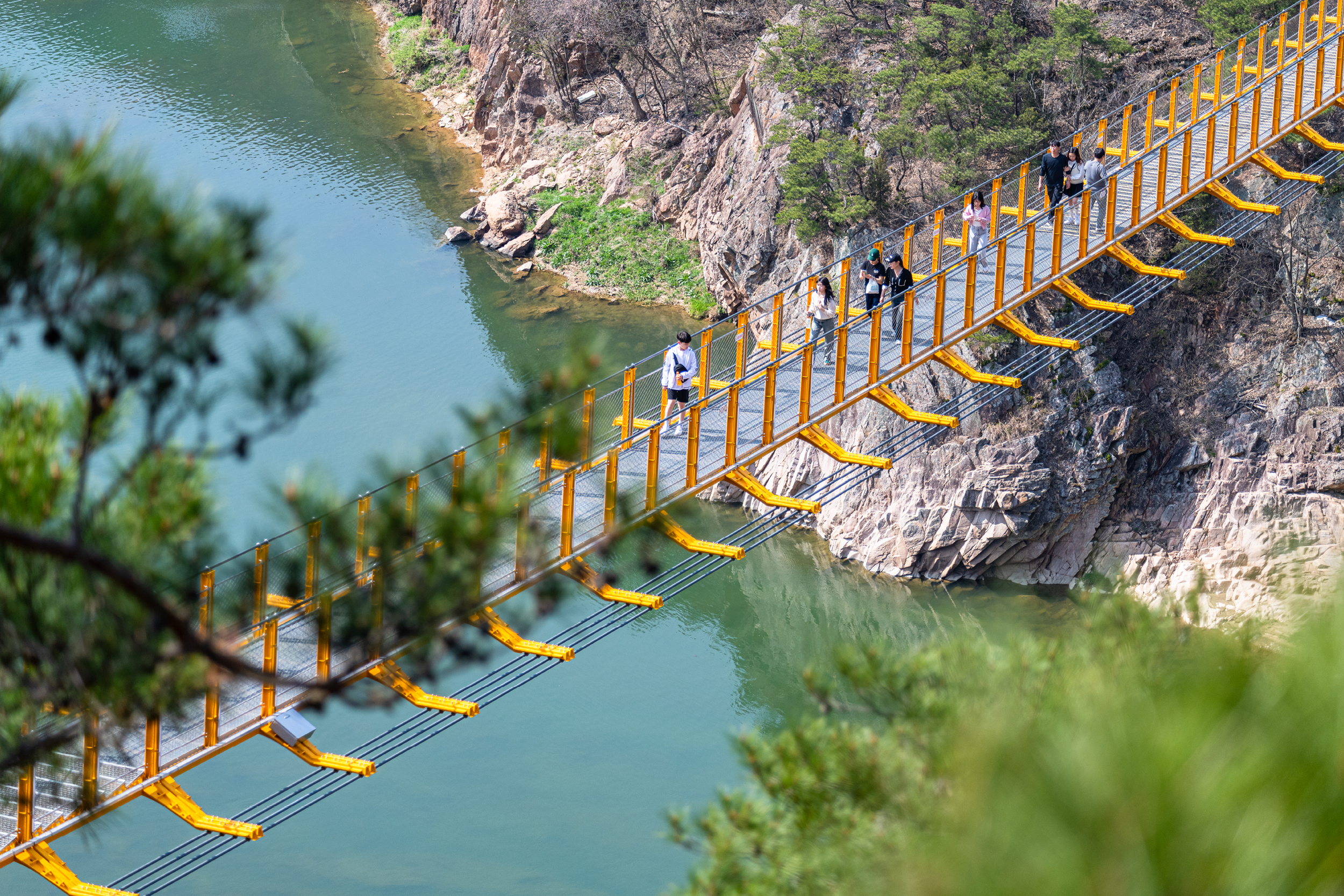 금강 상류지역엔 물굽이가 유독 많다. 물길이 얼마가 자주 굽이지고 휘어지는지 ‘U’자나 ‘S’자는 흔할 정도다. 지도를 보면 ‘W’자나 오메가(Ω) 모양으로 굽이치는 물길도 보인다. 금산에서 금강을 따라 걷는다는 건 물길의 흐름대로 휘어진 길을 따라 걷는다는 뜻일 것. 길이 크게 한 번씩 휘어질 때마다 같은 듯 미세하게 다른 풍경들이 다가오며 열린다. 그러다 ‘와’ 하는 함성을 일게 하는 곳이 나타난다면, 그곳이 바로 원골유원지다. 부엉산 바위벼랑을 타고 흐르는 인공폭포가 있는 원골유원지는 최근 금산에서 가장 ‘핫’한 곳이다. 금강 상류지역의 물굽이를 조망할 수 있는 ‘월영산 출렁다리’ 덕택이다. 금강을 기준으로 양 옆에 있는 두 개의 산이 출렁다리로 연결되면서, 시선에 담기는 풍경의 넓이와 높이가 부쩍 달라졌다. 일명 ‘뷰 맛집’으로 등극했다. 소문난 뷰포인트는 월영봉전망대. 디딜 때마다 맥박이 쿵쿵대도록 출렁거리는 다리를 지나 월영봉전망대에 닿으면, 부엉산 기슭을 ‘S’자로 휘도는 금강의 면모가 제대로 드러난다. 물이 산을 깎은 것인지 산이 물을 가둔 것인지는 알 수 없지만, 산과 산 사이를 굽이져 흐르는 금강이 얼마나 빼어난 물길인지, 한눈에 훤하다. 금강은 4대강 중 유일하게 북으로 흐르는 강이다. 북쪽이 위쪽이라는 인식으로 보면 ‘거꾸로 흐르는 강’이다. ‘거꾸로’라는 단어는 어쩐지 힘이 세다. 어쩌면 물 스스로 의 힘으로 길을 찾은 것은 아닐지.