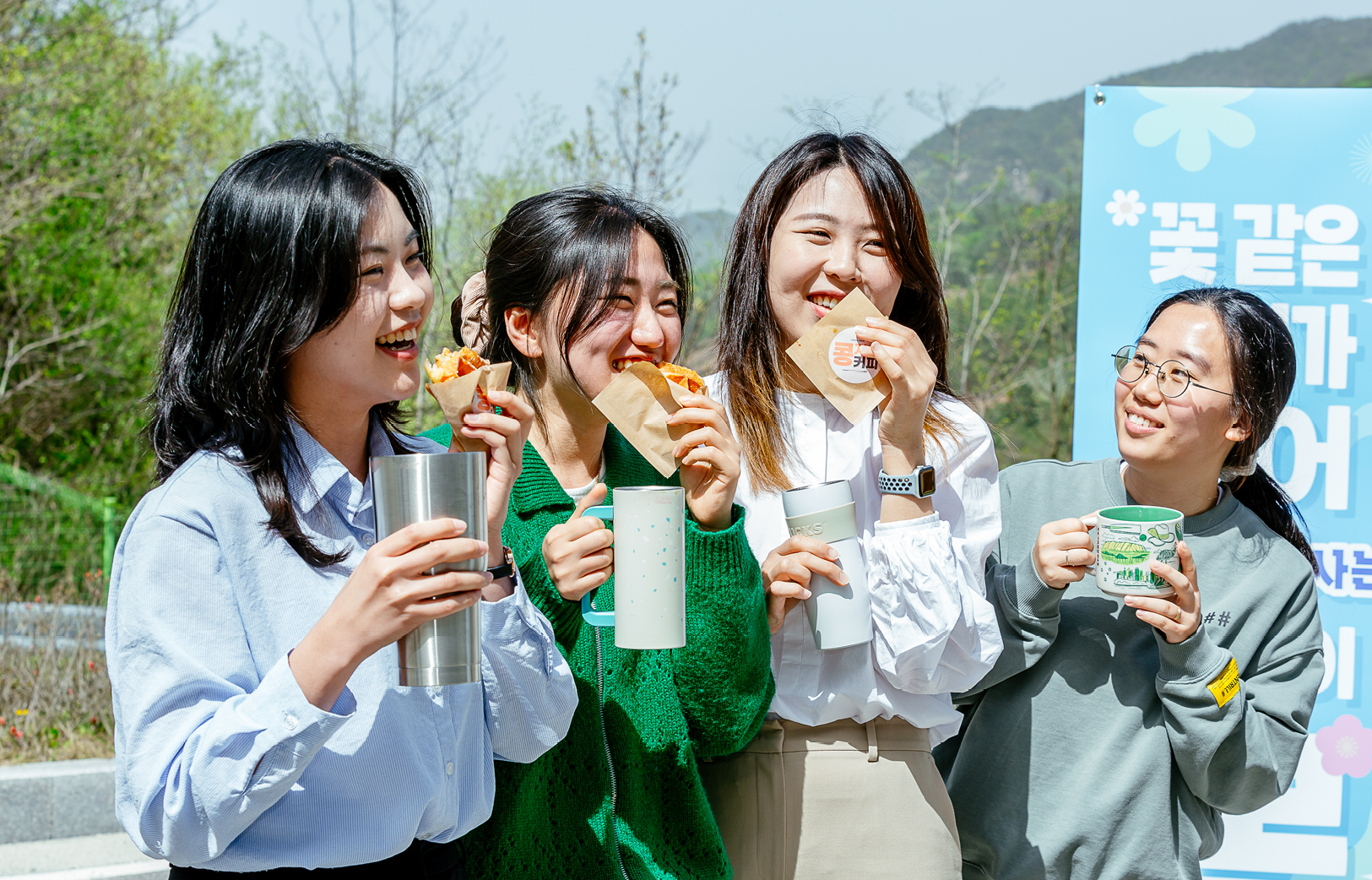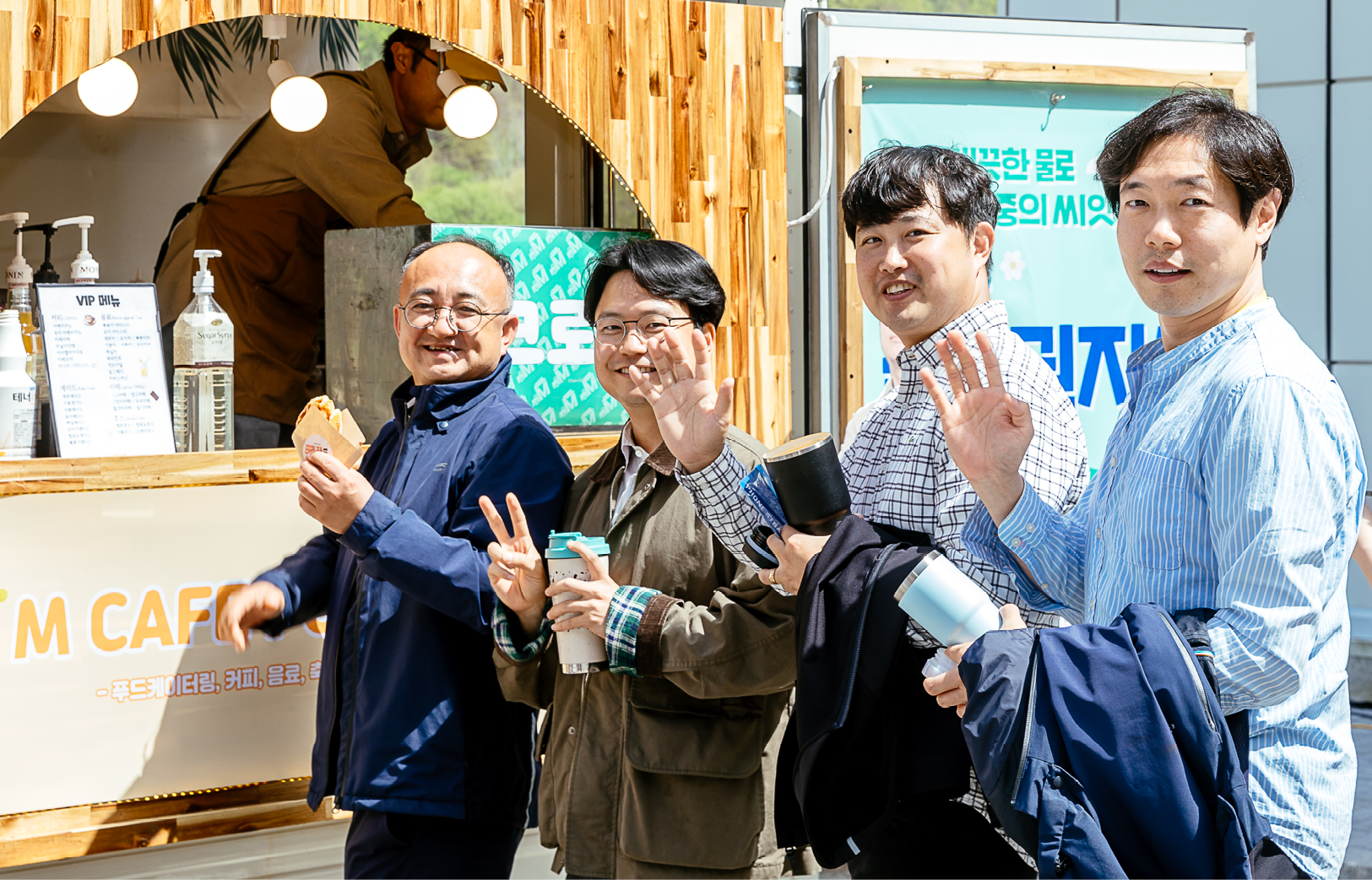 작년 가을 금산수도센터와 정수장이 분리된 이후, 직원들은 서로의 소중함을 더욱 느끼고 있다. 광역상수도를 지방상수도로 공급하는 연계된 업무를 하다 보니, 서로의 업무에 대해 궁금한 점이 많았지만, 물리적인 거리 때문에 편하게 이야기 나누기가 어려웠던 것. 더군다나 각자 거주지가 각기 다른 도시에 있어 함께 모이는 일이 쉽지 않았다. ‘갈증은 수(水)타벅스로 해결’하자는 마음에, 양쪽에서 모두 근무해 본 양진아 과장이 정성스럽게 사연을 작성해 이벤트에 신청했다. 그리하여 푸르게 물든 산새와 곳곳에 핀 가지각색의 꽃들을 벗 삼아, 이곳에 잘 어울리는 우드톤의 하얀 커피차가 도착했다. 가장 먼저 커피차를 반긴 양진아 과장이 말을 이었다. “두 아이를 낳고 육아휴직 후 작년 초에 복직했어요. 그러다 가을에 사무실 이전을 하면서 정수장에서 근무하기 시작했는데요. 잘 적응할 수 있도록 도움 준 우리 직원들에게 좋은 추억을 선물하고 싶어서 이렇게 수(水)타벅스 이벤트를 신청하게 되었답니다.” 금산수도센터와 직원들이 버스에서 내려 한데 모이자 한 손에는 크로플을, 한 손에는 시원한 커피를 들고 반가운 인사가 오간다. “잘 지냈어?” “여기 벤치 예쁜데?” “막여과 정수시설은 처음 봐요” 오랜만에 소풍을 나온 듯, 화기애애한 직원들. 정수장이 처음이거나 오랜만인 이들도 있다. 어제 저녁까지만 해도 비가 왔지만 언제 그랬냐는 듯 날씨도 분위기에 힘입어 푸근하다. 수(水)타벅스에 꼭 참여하고 싶었지만 교육 일정과 겹쳐 오지 못한 김수완 과장은 등신대로 제작해 함께 참여한 것도 이색적인 이벤트가 됐다. 김범석 지사장은 그런 직원들의 얼굴을 보며 인자한 미소를 지어낸다. “수도센터와 정수장 모두 여러 일로 고생이 참 많은데요. 오늘 커피 한 잔과 달콤한 디저트로 다시 힘내서 앞으로 나아갈 수 있는 금산권지사가 되길 바랍니다.” 비록 몸은 떨어져 있을지라도 각자의 자리에서 최선을 다하는 직원들이 있기에 금산권지사는 하나의 방향으로 나아가고 있다. 늘 지금처럼, 금산과 진안, 그리고 광역과 지방을 아우르며 지역주민들의 갈증을 해소해주는 금산권지사가 되기를 응원한다.