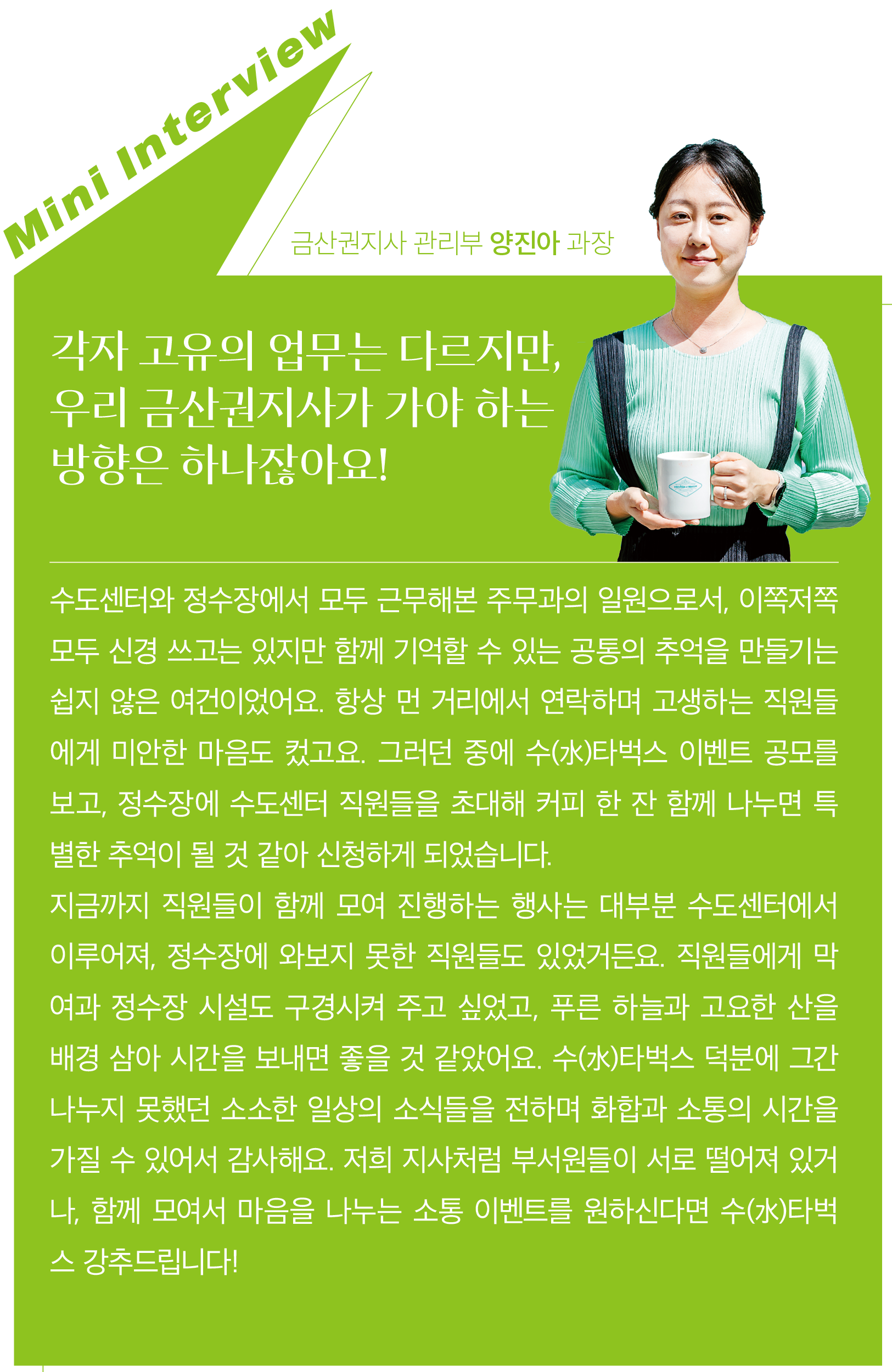 금산권지사는 남일면에 위치한 금산정수장과 금산읍에 위치한 금산수도센터로 구성되어 있다. 금산정수장은 금산군과 진안군 지역에 안전하고 깨끗한 수돗물을 제공하는 역할을, 금산수도센터는 지방상수도 위수탁 업무를 맡고 있다. 정수장과 금산수도센터의 거리는 무려 16km. 작년 10월, 수도센터 내에 있던 경영과가 정수장으로 사무실을 이전하면서 관리부와 수도센터가 물리적으로 분리되었다. 시설점검과 수용가 관리 등 민원대응과 복구로 외근이 잦고, 양쪽 사무실을 오가며 업무를 처리해야 하는 경우도 많아 더욱 분주해진 것이 사실. 수(水)타벅스가 방문한 날도 수도센터 직원들의 밤샘 근무가 이어진 후였다. “외근이 많은 수도센터만큼이나 정수장도 바쁘게 돌아가고 있는데요. 이제 곧 송수관로 계통분리 공사 준공을 앞두고 있어 막바지 공사가 한창이랍니다.” 관리부 설비운영과 조윤정 대리의 말처럼, 지난 4월 금산정수장은 진안군-금산군 간 계통분리 공사가 한창이었다. 이뿐만이 아니다. 금산정수장에는 K-water가 운영하는 정수장 중 단 세 곳에만 존재한다는 막여과 정수시설이 있다. 막여과 정수시설은 0.1마이크로미터 크기의 막을 사용하고, 폐쇄형여과설비로 운영되어 깔따구 등의 유입을 원천 차단할 수 있는 시설이다. 올해에는 정수장의 여과 성능을 개선하기 위한 막모듈 설비 전면 교체가 예정되어 있어, 한층 더 분주해질전망이다.