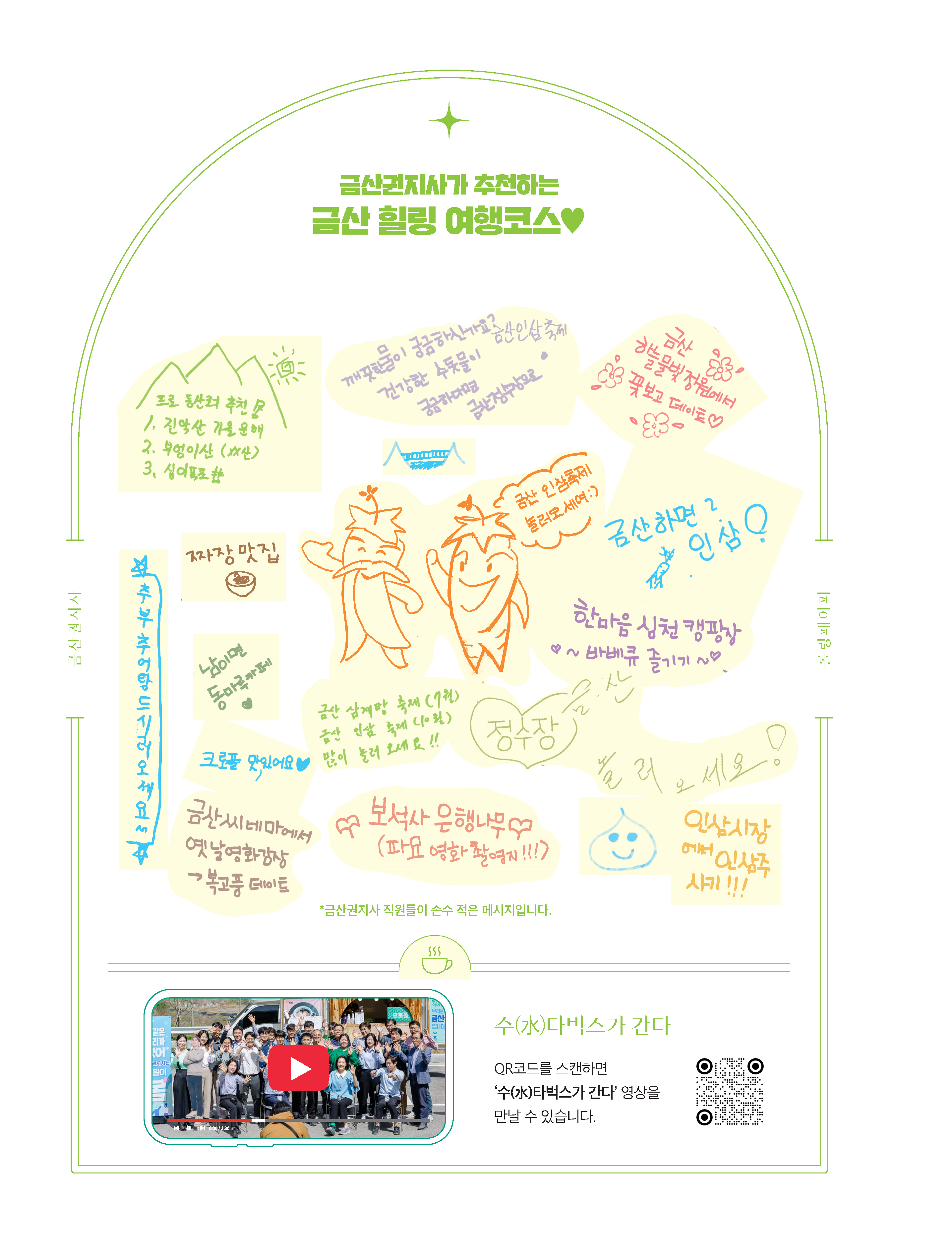 푸른 산길을 따라 들어가자 펼쳐진 정수장 풍경. 눈부시게 환한 봄, ‘매일이 봄’이라는 이들을 만났다. 광역과 지방을 아우르며 깨끗하고 안전한 물을 공급하고 있는 금산권지사. 그리고 이들에게만 있다는 정수장까지, 금산권지사의 숨겨진 면모를 소개한다.