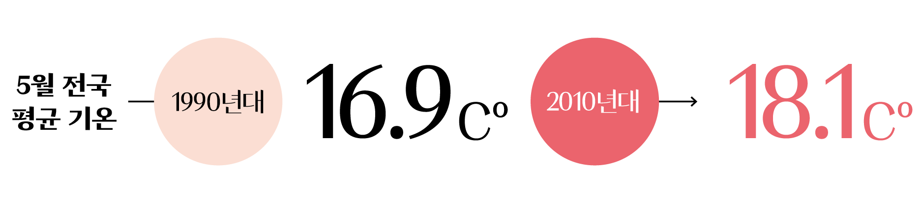 지난해만 해도 역대 가장 따뜻한 3월이 지난 뒤 꽃샘추위가 강하게 나타나면서 많은 농작물이 냉해 피해를 입었었는데요. 올해도 변덕스럽던 3월이 지나자마자 4월 초부터 이례적인 고온 현상이 나타나며 초여름 날 씨가 갑작스레 찾아왔습니다. 서울의 경우 낮 기온이 30도까지 오르며 중순 기준으로는 역대 1위를 차지했습니다. 4월 전체로는 역대 3위를 기록하기도 했는데요. 1, 2위는 4월 하순의 기록으로, 중순에 이러한 기록을 세우는 것은 이례적입니다. 북쪽의 찬 공기와 남쪽의 따뜻한 공기의 세력이 엎치락뒤치락하다가 남쪽의 따뜻한 세력이 본격적으로 밀고 올라오면서 시작되는 게 여름인데요. 제대로 된 봄이 시작하기도 전에 여름이 성큼 찾아온 겁니다. 기후 변화로 인해 봄철 기온은 계속 오르면서 여름의 시작일 또한 크게 앞당겨 졌습니다. 과거에 평균적으로 6월 11일이었던 여름의 시작일도 최근 들어서는 5월 30일로 앞당겨졌습니다. 그만큼 5월의 기온도 많이 올랐다는 건데, 5월 전국 평균 기온이 1990년대(1990년대~1999년) 16.95도였는데, 2010년대(2000~2019년)에는 18.11도로 무려 1.2도나 높아진 것으로 나타났습니다.