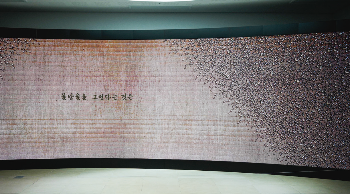 모든 관람을 마치고 나가면 건물 가운데 빛의 중정이 펼쳐진다. 연못 가운데 놓인 커다란 물방울 세 개는 설치미술 <삼인>이며, 십 분마다 가동되는 분수는 무지개를 그려내며 동화 같은 풍경을 완성한다. 물방울이 만들어내는 울림이다. 제주도립 김창열미술관은 단순히 그의 작품을 전시하는 공간을 넘어 물방울에 담긴 사유와 치유의 메시지를 전하고 있다. 이곳에서 우리는 물방울 속에 담긴 작가의 시선을 마주할 수 있다.