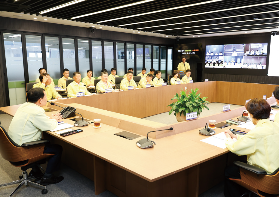 지난 8월 21일 한국수자원공사는 대전 본사에서 ‘전사 안전활동 소통회의’를 개최했다. 이날 회의에는 윤석대 사장을 비롯해 전 임원, 본부장, 주요 부서장 등 38명이 참석하였으며, 전사 재해현황과 주요 안전활동을 공유하고 사전예방 중심의 안전관리 체계를 점검했다. 특히 최근 폭염과 국지성 집중호우 등 잦은 기상변화에 따른 현장의 안전관리 난이도가 높아짐에 따라 예방 중심의 안전대책을 한층 강화하고 스마트 안전관리 체계를 현장 전반에 확대하기로 했다.