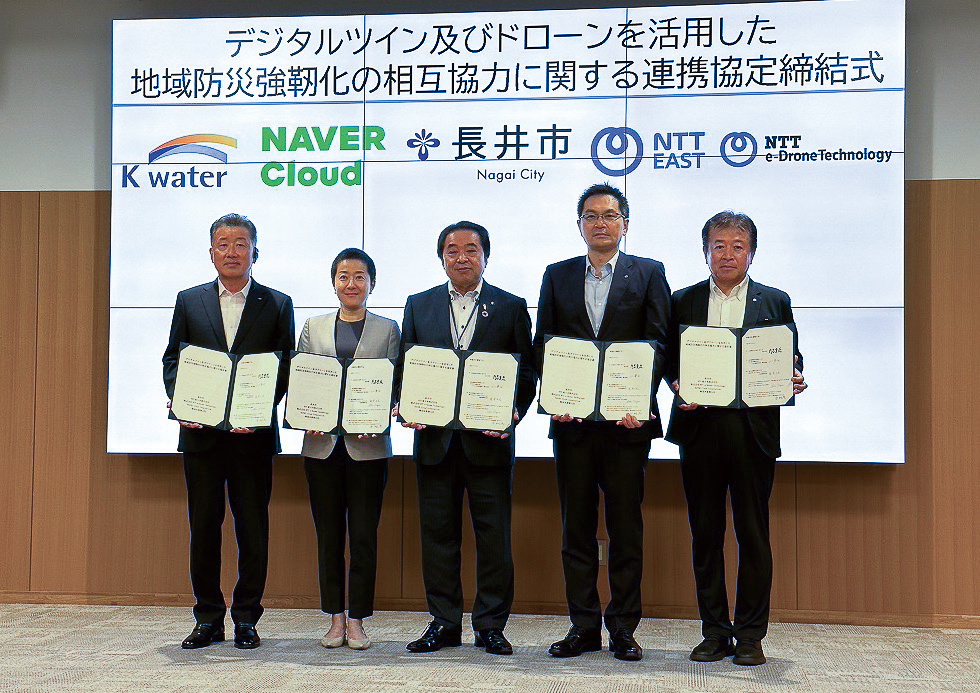 역량 강화 업무협약 체결지난 8월 6일 한국수자원공사가 재난대응 역량 강화를 위해 일본 나가이시, NTT 동일본주식회사, NTT 이드론 테크놀로지, 네이버 클라우드와 함께 디지털 트윈 및 드론을 활용한 상호협력에 관한 업무협약을 체결했다.