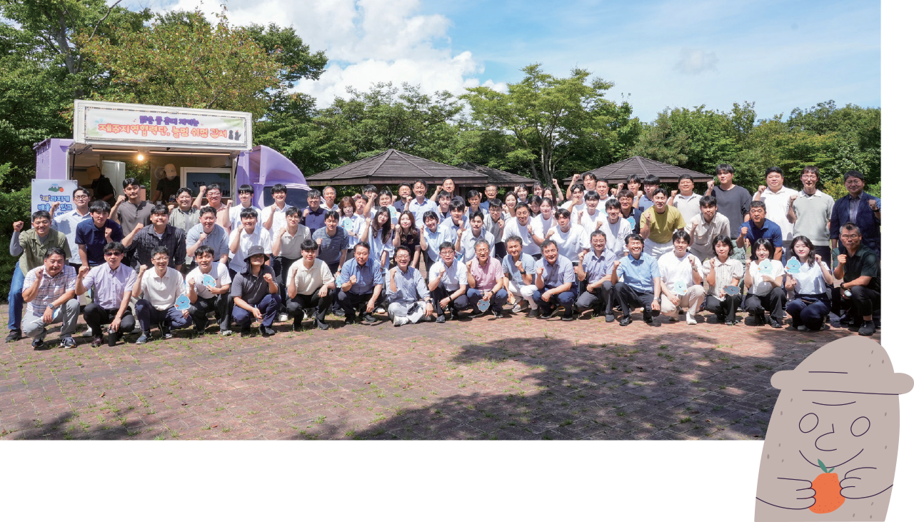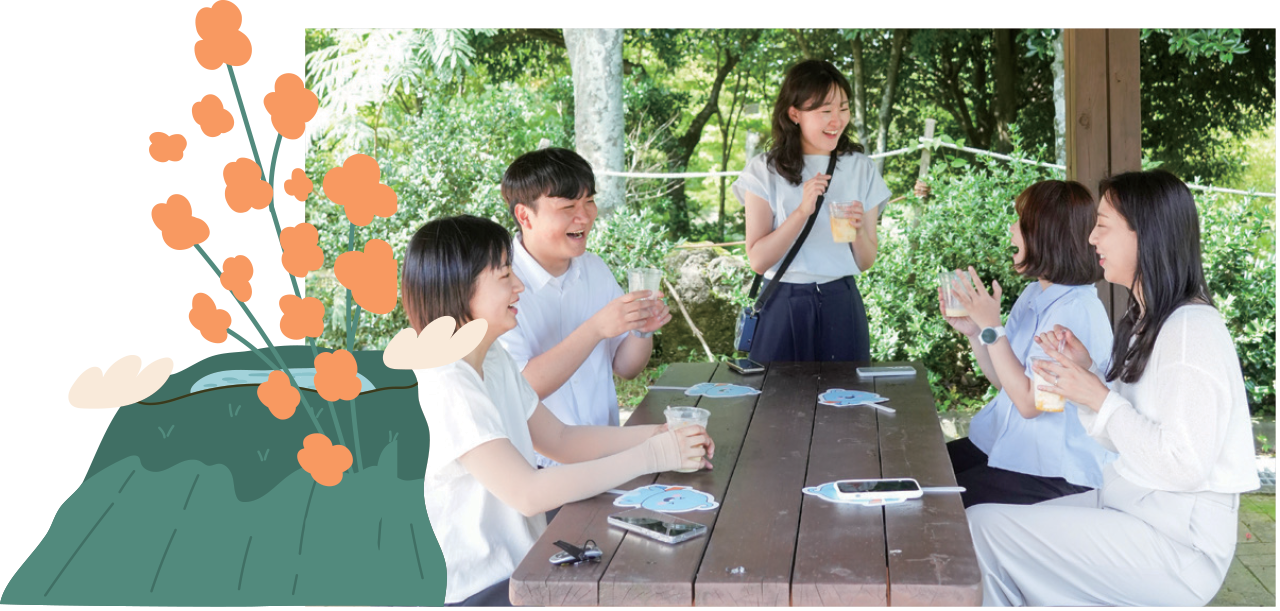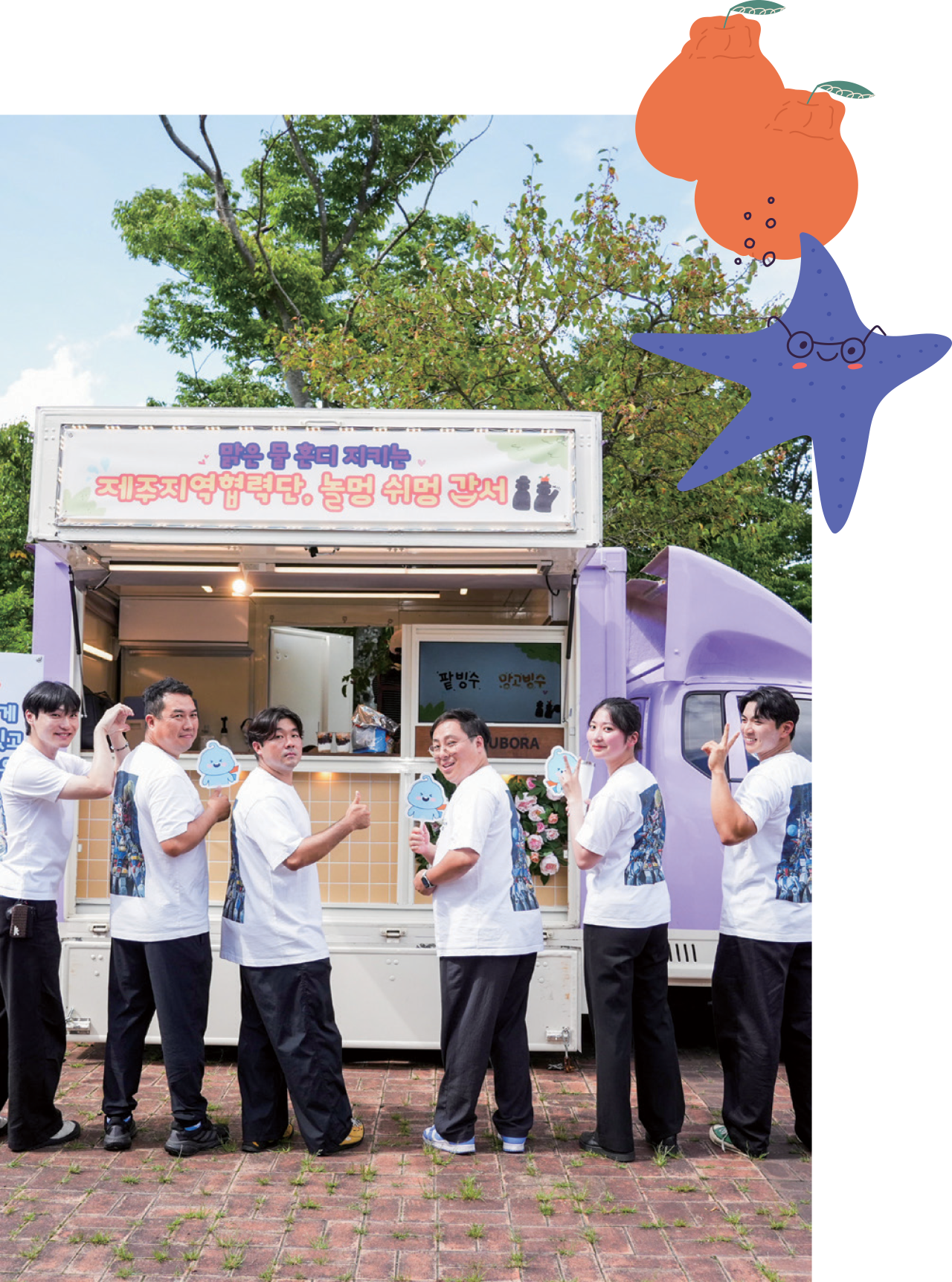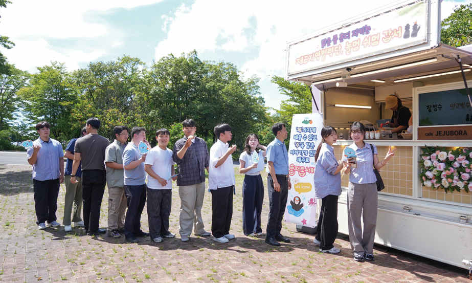 늦더위가 마지막까지 기승을 부리던 날, 이들이 손에 받아든 특별한 간식은 빙수였다. 빙수의 근본인 ‘팥빙수’와 새콤달콤한 맛이 매력적인 ‘망고빙수’ 중 취향에 따라 하나씩 골라 들고 벤치에 둘러앉아 소풍 온 기분을 만끽했다. 오랜만의 휴식을 즐기는 직원들을 흐뭇하게 바라보던 심과학 단장이 질문을 던졌다. “혹시 제주도 올레길 걸어보셨어요? 멋진 풍경을 보며 걷다 보면 생각도 정리되고 기분도 좋아지는데, 꼭 한 번 들러보세요.”라고 말했다. 그의 말에 26년차 제주 토박이라는 김형환 인턴은 “저는 비자림을 추천합니다. 거기에 사랑이 이루어진다는 ‘사랑나무’ 가 있으니 꼭 들러보세요!”라며 덧붙였다.
