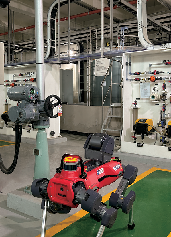 이와 함께 앞으로는 정수장에서 수행되는 설비 점검, 진단, 사고대응 등의 고위험 작업 구간에 4족 보행 지능형 로봇이 투입된다. 설비 혼재, 지하 공간 등 위험 요소가 많은 현장에서 물리적· 인지적 한계로 인한 위험 노출과 고령화, 미숙련 작업자 등 인력 기반 운영에서의 한계를 극복하기 위함이다. 지능형 로봇은 자율주행 및 특정 구역 운영 기능과 다양한 센서의 조합을 통해 작업의 안전성을 높이는 동시에, 누수, 화재 등 시설과 설비 상태를 데이터화한다. 이를 시설관리시스템 등과 연계, 분석하여 데이터 기반의 진단 점검체계를 실현하고, 향후 센서 - AI - 로봇을 연계한 상수도 분야의 physical AI 선도모델로 발전할 수 있을 것으로 전망된다.