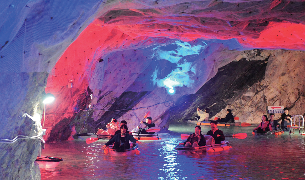 광산에 다시 사람이 모여든 것은 2019년. ‘활옥동굴’이라는 이름으로 새단장을 한 이곳에는 활석을 캐던 광부 대신 동굴을 탐험하기 위한 관광객들의 발걸음이 이어지고 있다. 활옥동굴은 전체 길이 57km에 달하는 갱도 중 약 2.3km 구간을 정비하여 조성한 체험형 테마파크이며, 옛 광산사업소 사무실은 식당으로, 활석 제분공장은 카페로 바뀌었으며 이밖에 수경재배 빛조형물 전시, 수경재배, 와인 저장고 등 10개가 넘는 체험공간이 마련되어 있다.