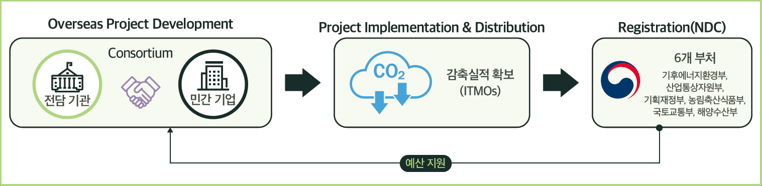우리나라는 2030년 온실가스 배출량의 약 12.9%에 해당하는 37.5백만tCO₂E을 국제감축사업을 통해 달성한다는 목표를 설정했다. 이를 위해 정부는 탄소중립녹색성장위원회를 중심으로 6개 부처를 주관기관으로 지정하고 각 부처별 실행 전담기관을 별도로 선정하여 사업을 추진 중이다. 기후에너지환경부(폐기물·물·환경 분야), 산업통상자원부(산업·발전 분야), 기획재정부(예산·정책·협정 참여), 농림축산식품부(임업 분야), 국토교통부(건물·교통·건설 분야), 해양수산부(해양·수산·해운·항만 분야)가 부문별 주관기관이며, 한국수자원공사는 기후에너지환경부가 담당하는 물 분야의 실행 전담기관으로 참여하고 있다. 우리나라의 국제감축사업은 정부·공공 부문이 주도하고 민간기업이 실행 파트너로 참여하는 구조로 운영된다. 정부와 공공기관이 사업을 기획·발굴하고, 예비 타당성 조사나 감축설비 설치 등 사업비의 일부를 지원하며, 민간기업은 이를 바탕으로 실질적인 온실가스 감축성과를 창출한다. 이를 통해 우리 기업의 해외 진출과 국가 감축목표 달성을 동시에 견인하고, 기후대응과 산업 경쟁력을 함께 강화하는 새로운 협력 체계로 자리매김하고 있다. 2024년 12월 기준, 우리나라는 ‘기후변화 협력에 관한 기본협정’을 통해 베트남, 몽골, 가봉, 우즈베키스탄 등 9개국과 협정을 체결하였으며, 스리랑카, 가나, 방글라데시 등 4개국과는 가서명을 완료하였다. 필리핀, 세네갈, 콜롬비아 등 3개국과의 협정도 추진 중으로, 글로벌 협력의 폭을 계속 넓혀가고 있다.