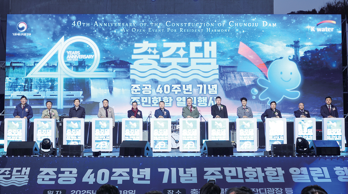 지난 11월 18일 한국수자원공사가 충주댐 물문화관 잔디광장에서 충주댐 준공 40주년을 기념하는 행사를 개최했다. 행사에는 국회의원, 충청북도지사, 충주시장, 제천시장, 단양군수 등 주요 내빈과 지역주민 700여 명이 참석해 자리를 빛냈다. 이들은 지난 40년간 충주댐이 이뤄낸 성과를 돌아보고, 기후 대응과 지역 상생을 중심으로 한 미래 방향을 공유했다. 이번 행사는 충주댐이 단순한 수자원 공급 시설을 넘어 기후 변화에 선제적으로 대응하는 스마트 인프라이자 지역과 함께 성장하는 공간으로 나아가고 있음을 알리는 의미 있는 자리였다.