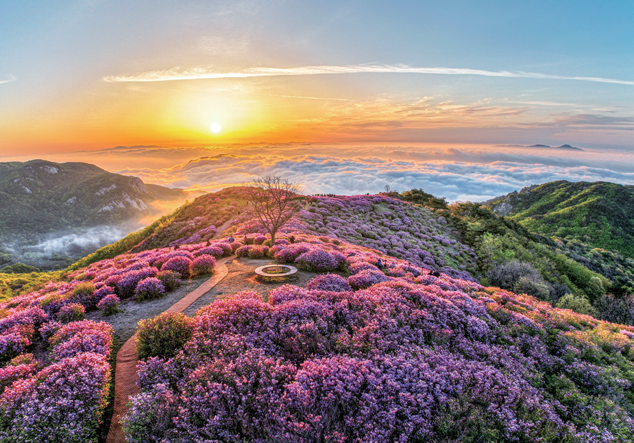 At an elevation of 800 to 900 meters, a breathtaking scene unfolds as if a purple silk carpet has been laid across the highlands. The pink waves of royal azaleas winding along the mountain ridges create a mystical feeling, as though walking above the clouds. Blooming abundantly across the vast grasslands that meet the sky, the flowers proudly display their colors even amid strong winds. Visitors can easily reach and take in the summit scenery by following the gently connected Barrier-Free Sharing Trail. The harmony of royal azaleas and magnificent rock formations resembles a grand work of art created by nature, leaving an unforgettable impression on hikers.