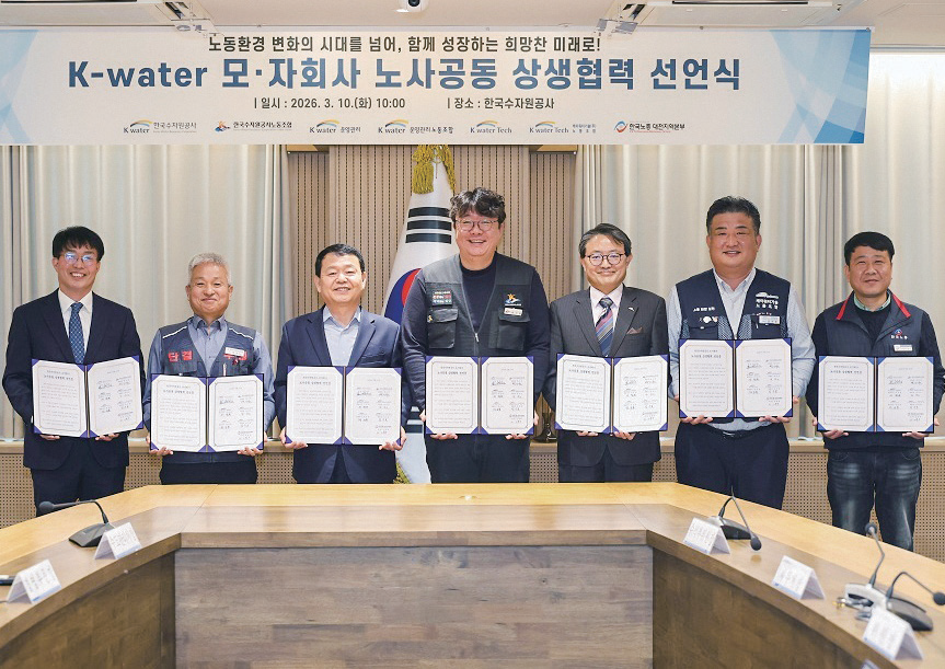 지난 3월 10일, 한국수자원공사는 대전 본사에서 자회사인 케이워터운영관리 및 케이워터기술주식회사와 함께 ‘노동환경 변화의 시대를 넘어, 함께 성장하는 희망찬 미래로’를 구호로 내걸고 ‘모·자회사 노사공동 상생협력 선언식’을 개최했다. 이번 선언식은 윤석대 사장과 박기찬 위원장을 비롯해 자회사 경영진 및 노조 대표, 한국노총 대전지역본부 관계자 등이 참석한 가운데 진행됐다.
